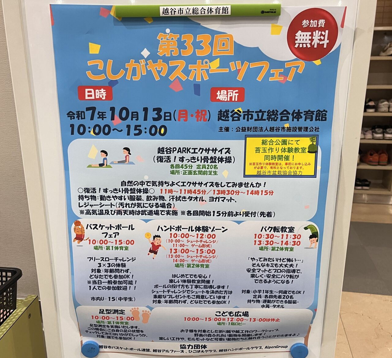 2025年10月13日(月・祝)10:00〜15:00に「第33回 こしがやスポーツフェア」が越谷市立総合体育館にて開催されます!