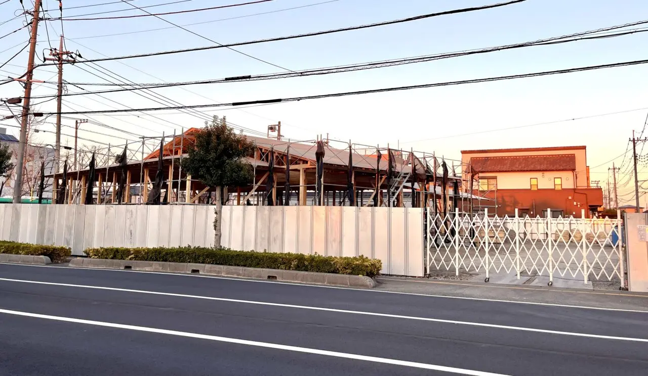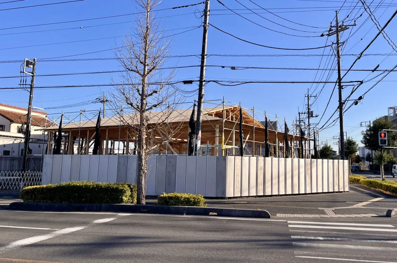 「コナズ珈琲 越谷店」の求人情報によると、お店の場所は「東越谷 9-6-1(仮)」となっております。2025年1月に閉店となってしまった「イオンバイク 東越谷店」も東越谷 9-6-1でしたので、現地にいってみると、以前のイオンバイクの建物はなく、新しい建物の工事を行なっているようでした。