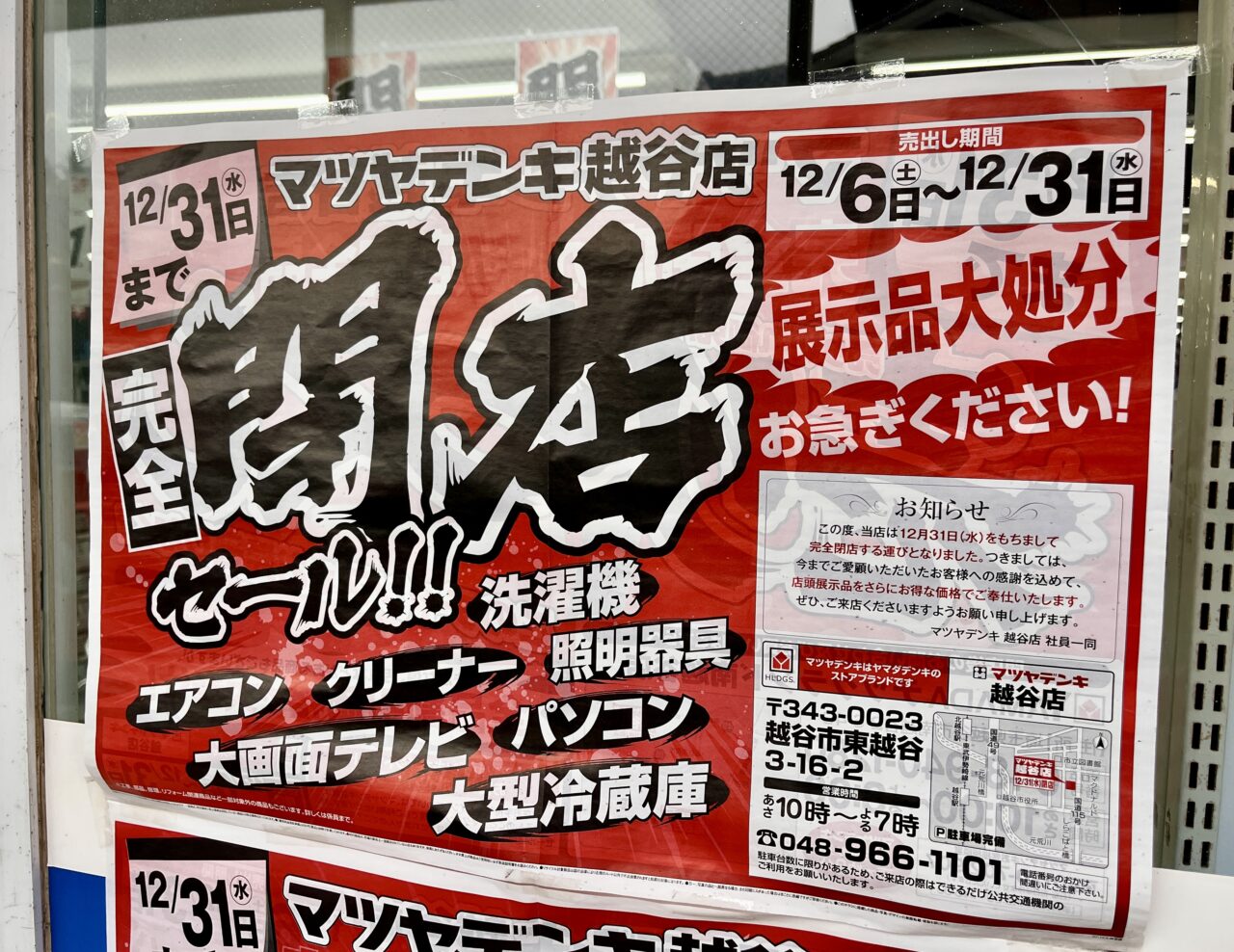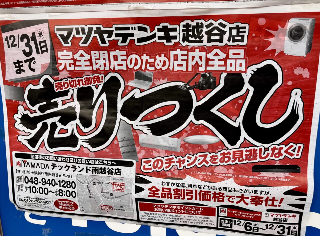 【越谷市】残念です・・・。産業道路沿いにある家電店「マツヤデンキ 越谷店」が閉店してしまうようです