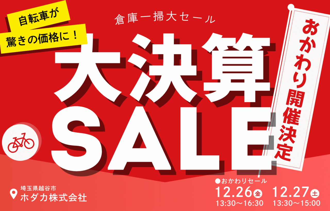 【越谷市】自転車が驚きの価格になるセールが再び!ホダカ株式会社による大決算セールが12月26日・12月27日に再度開催されます!