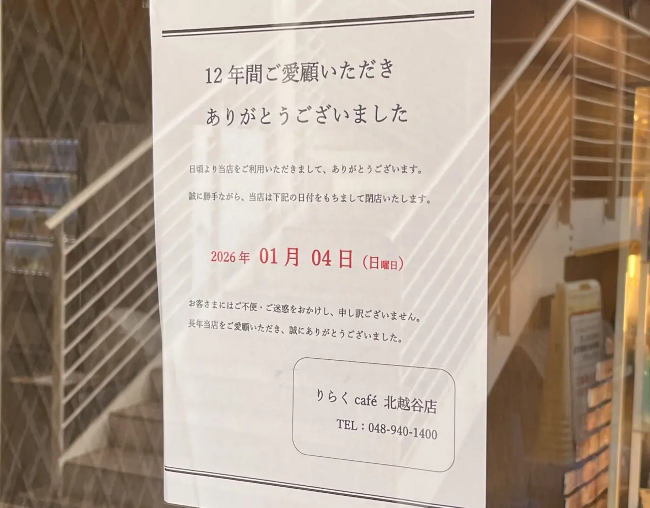 2026年1月4日をもって閉店となってしまう「りらくCafe 北越谷」はこちら↓