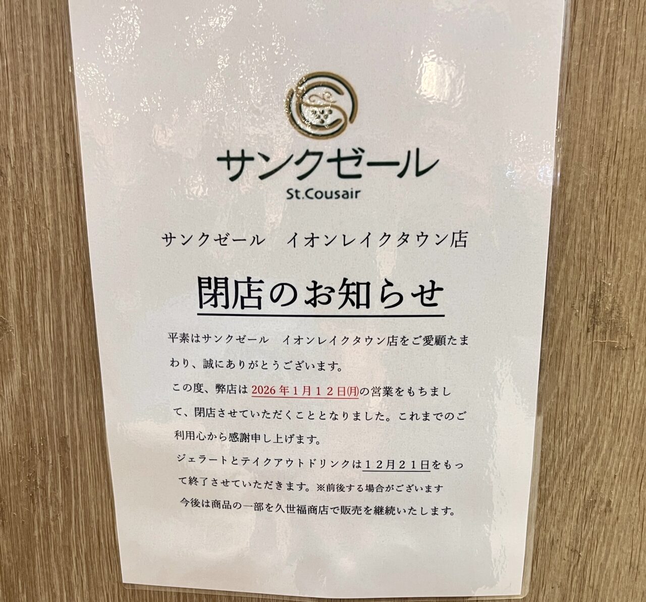 【越谷市】残念です・・・。イオンレイクタウンmoriにある「サンクゼール」が1月12日をもって閉店となってしまいます。