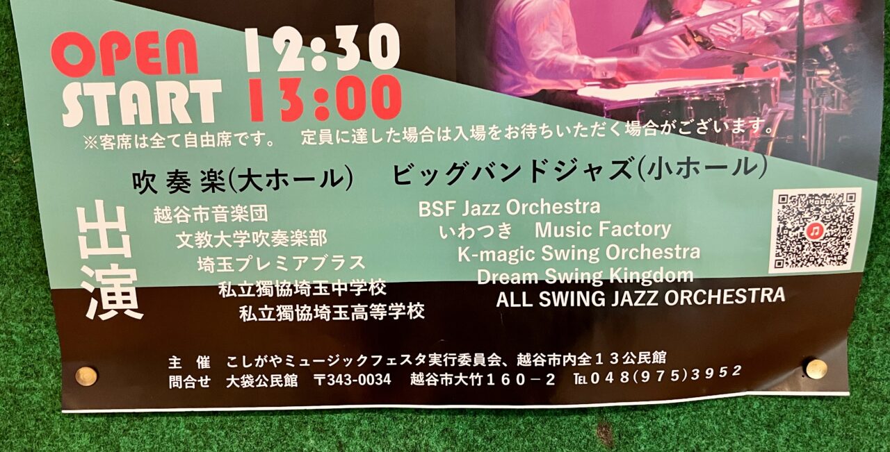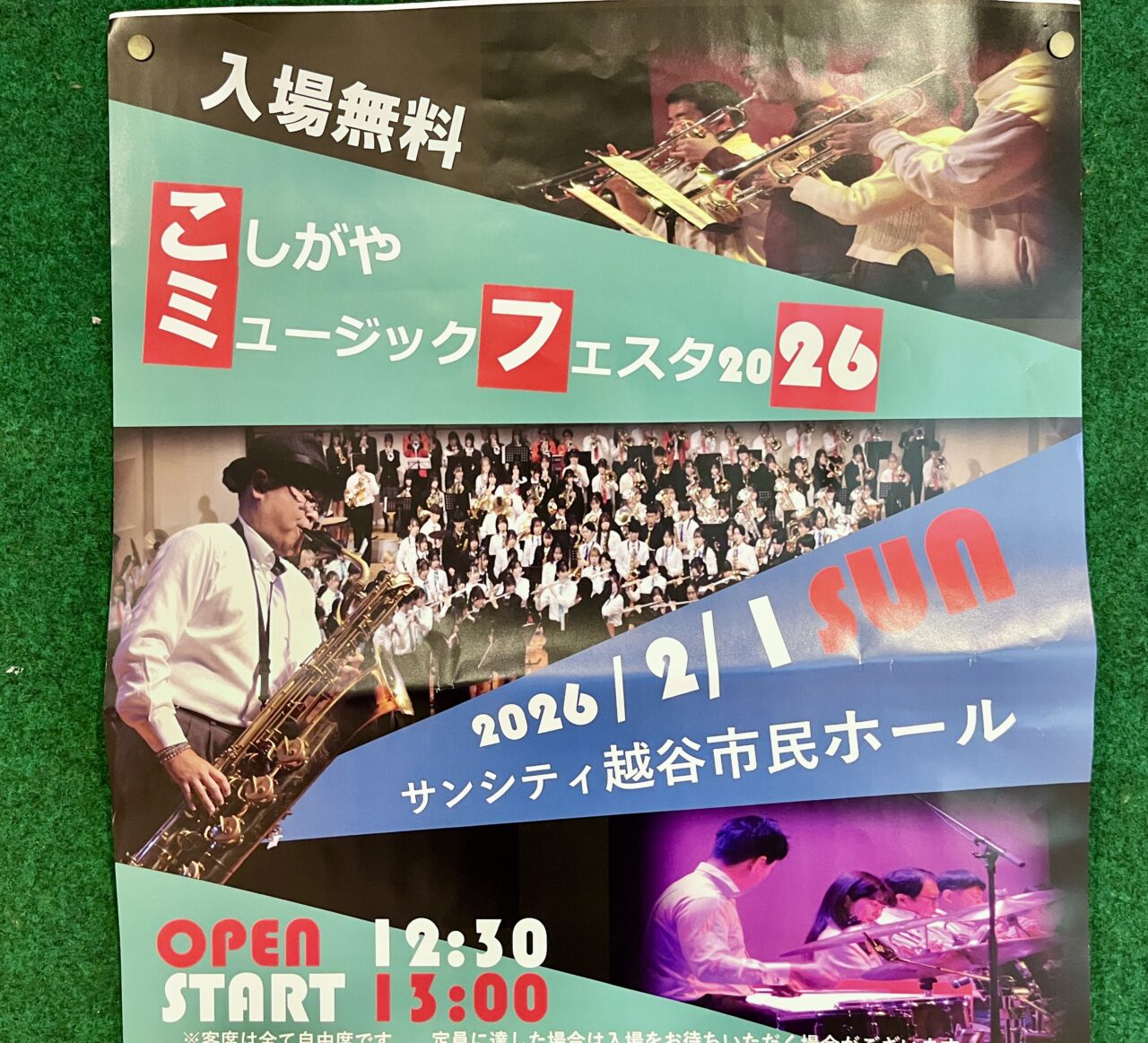「こしがやミュージックフェスタ2026」は、越谷市や近隣市町で活躍するアマチュア音楽グループによる音楽の演奏会で、大ホールでは吹奏楽、小ホールではビッグバンドジャズの演奏が行われるイベントのようです。