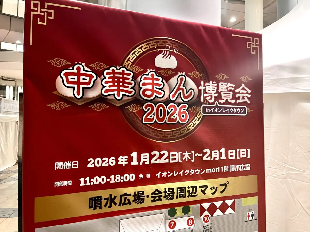 北海道から沖縄まで全国各地のご当地中華まんが100種以上集まるグルメイベント「中華まん博覧会2026 inイオンレイクタウン」が2026年1月22日(木)から2月1日(日)までイオンレイクタウンmori1F噴水広場で開催されております!