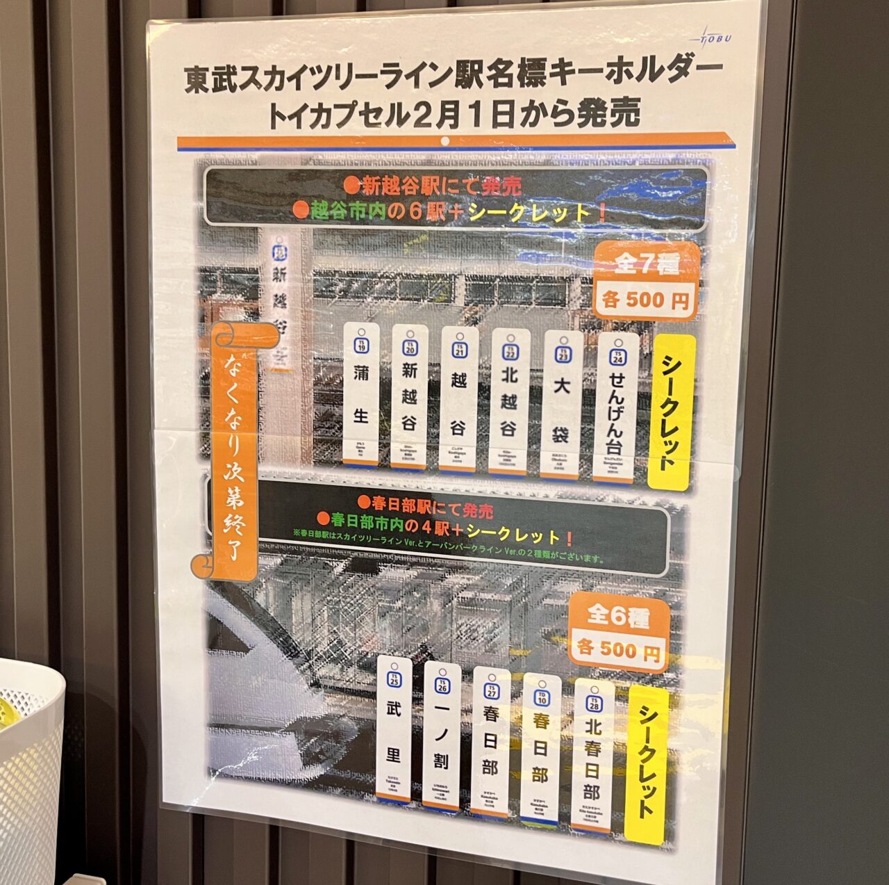 また、春日部駅には春日部地区の駅名標キーホルダーが販売されているようで、こちらは武里駅・一ノ割駅・春日部駅(2種)・北春日部駅・シークレットの全6種となっているようです。