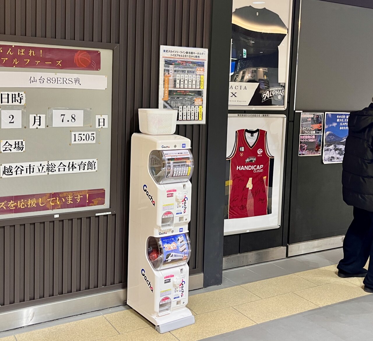 新越谷駅のカプセルトイの設置場所は中央改札口を出てすぐの場所となっております。限定販売となる駅名標キーホルダーを求めて、行列ができる場面もありました。