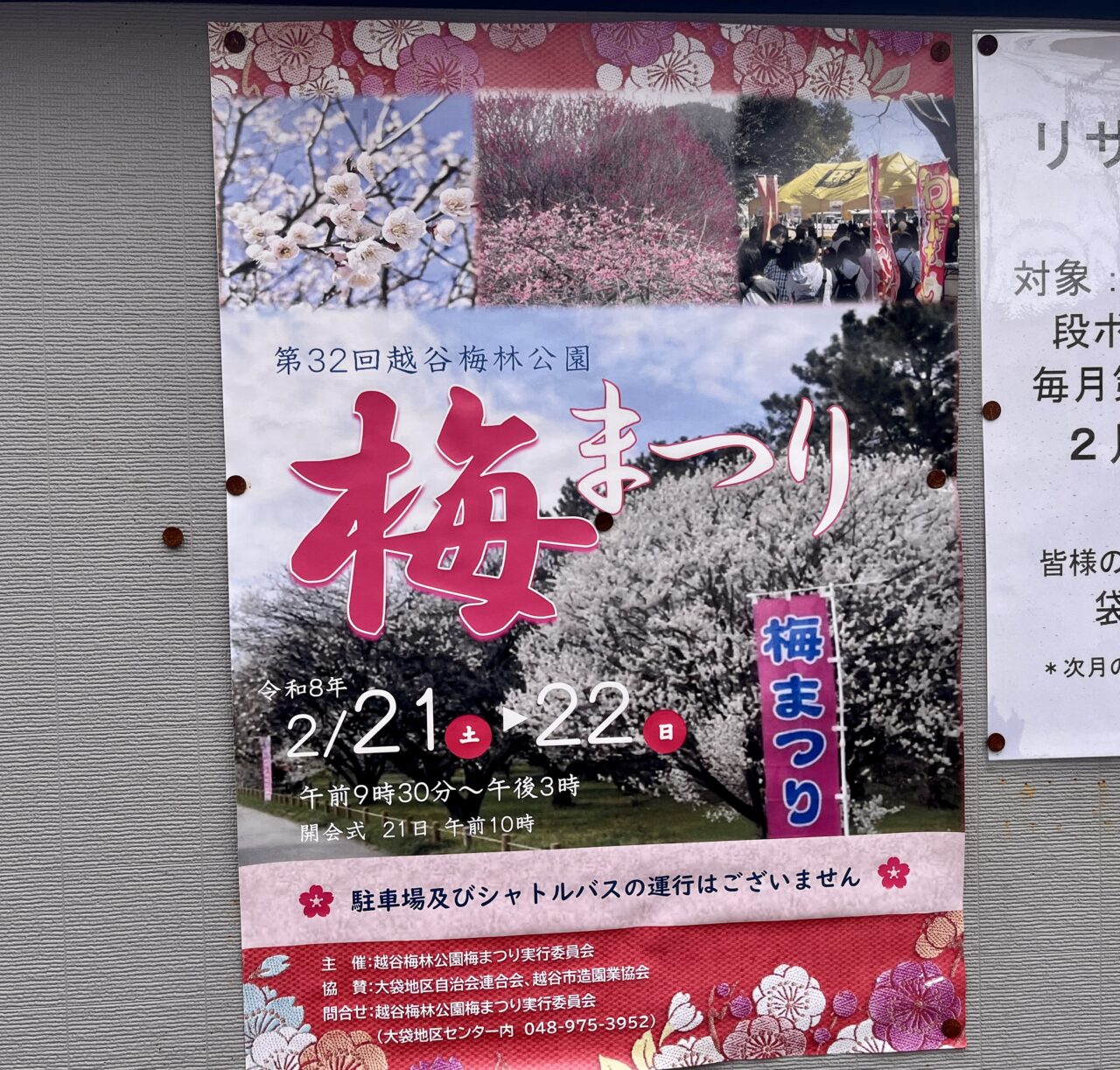 「第32回越谷梅林公園 梅まつり」は、2026年2月21日(土)・2月22日(日)の2日間、各日9:30〜15:00まで開催されるようです。(※開会式は2月21日10:00予定)