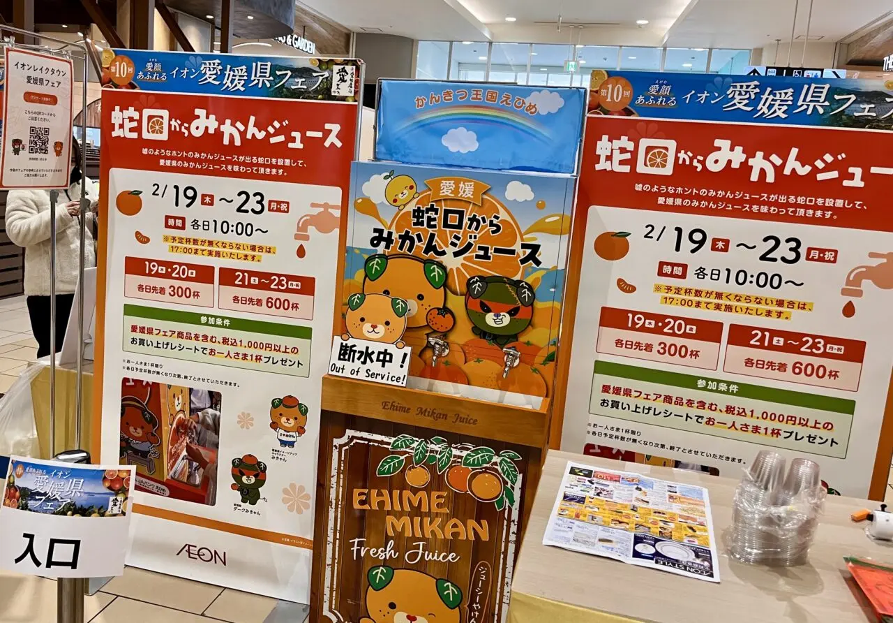 また、愛媛県フェア商品を含む、税込1,000円以上のお買い上げレシートの提示で、蛇口からでるみかんジュースを味わうことができるようです。(※先着順となっております。)