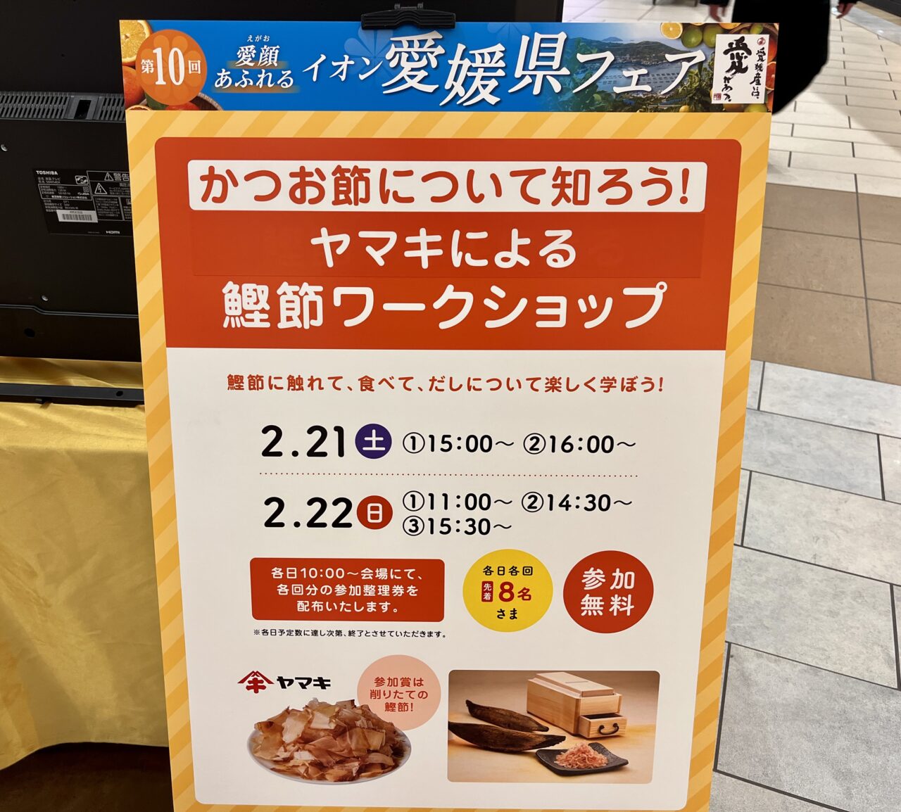 2月21日(土)には、開催記念セレモニーや「みきゃんグッズの詰め合わせ」が当たるお楽しみ抽選会のほか、愛媛県の鰹節・だしの会社「ヤマキ」による鰹節ワークショップも行われるようです。