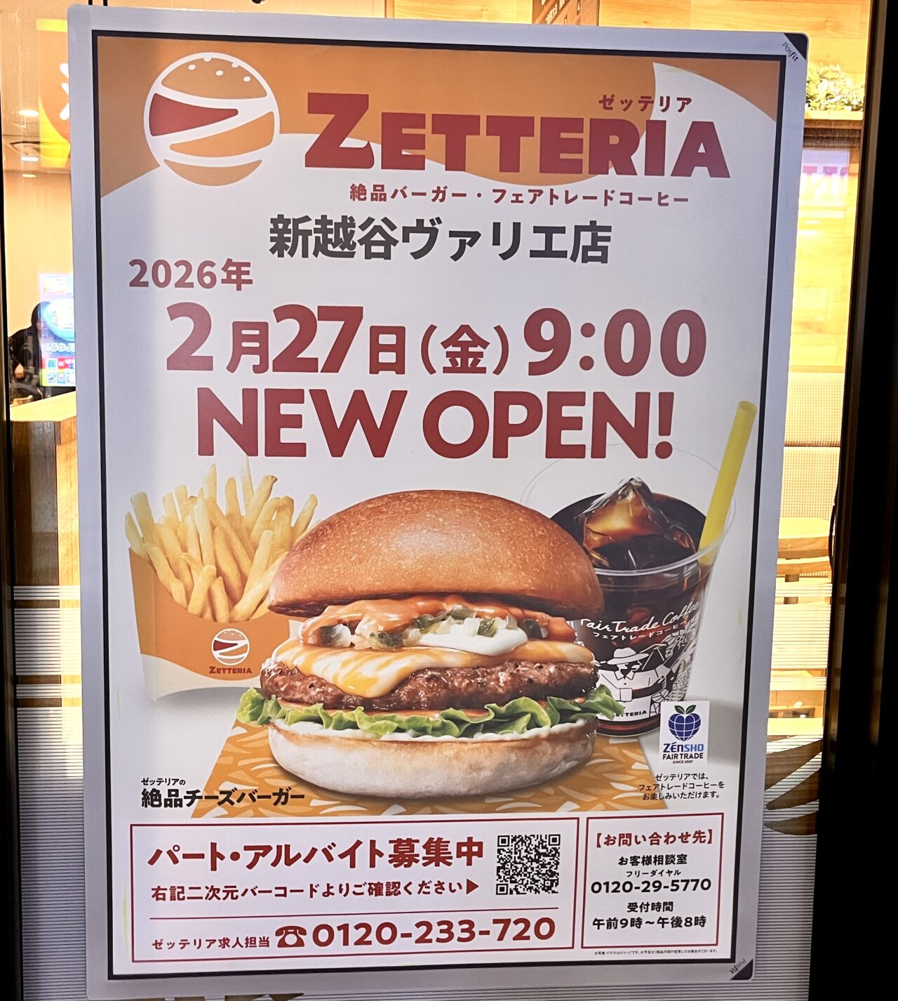 新越谷ヴァリエ1Fにバーガーチェーン「ゼッテリア」が2026年2月27日(金)にニューオープンしました!