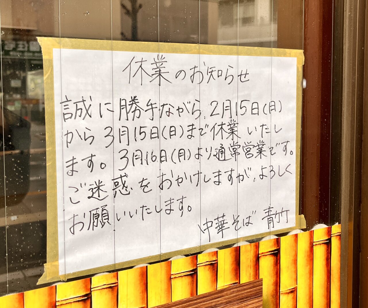 【越谷市】越ヶ谷1丁目の「中華そば 青竹」が3月15日まで休業中となっています。