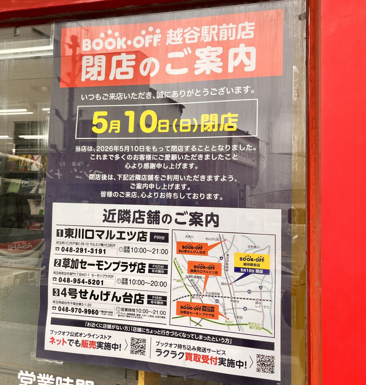 近隣の店舗は、東川口マルエツ店や草加セーモンプラザ店、4号せんげん台店があるようですが、駅近くで不要な本やCD等を売ったり、気になる本を安く購入することができるブックオフが閉店してしまうのは残念ですね・・・。
